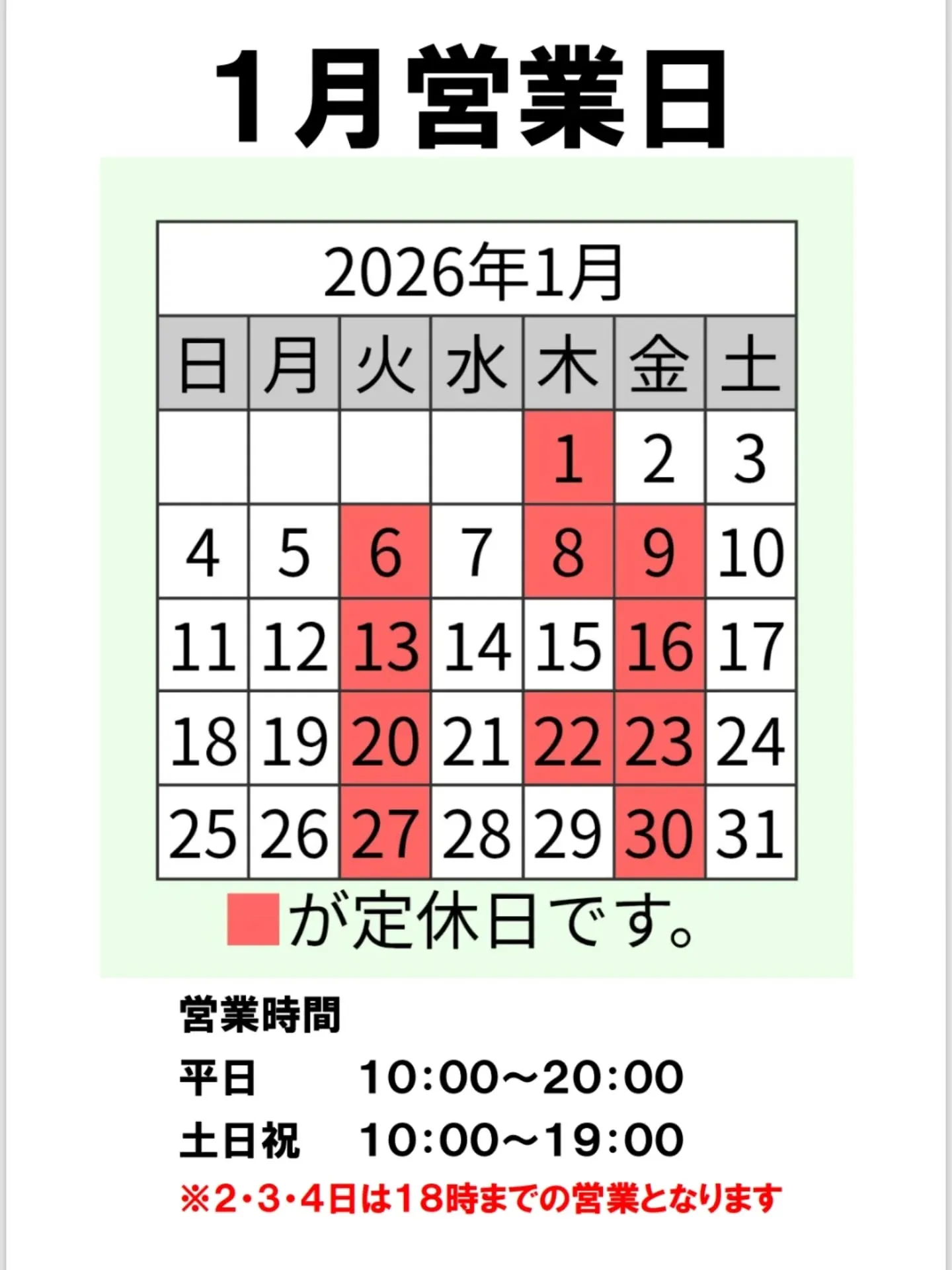 1月営業日のお知らせ 2025/12/26 1月営業日のお知らせ 1月は2日より営業開始致します😊 そして2日、3日、4日は18時までの営業となりますのでご注意下さい🤚 今年1年もあっと言う間に終わり🤯 沢山のご来店ありがとうございます😭 2026年も盛り上げて行きましょう‼️ 1月からも沢山のご来店お待ちしてしております😊