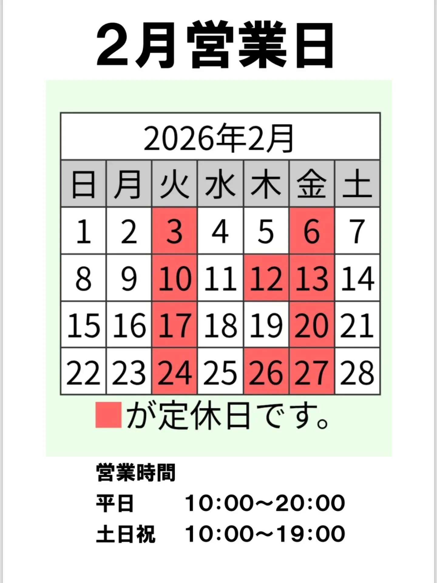 2月営業日のお知らせ