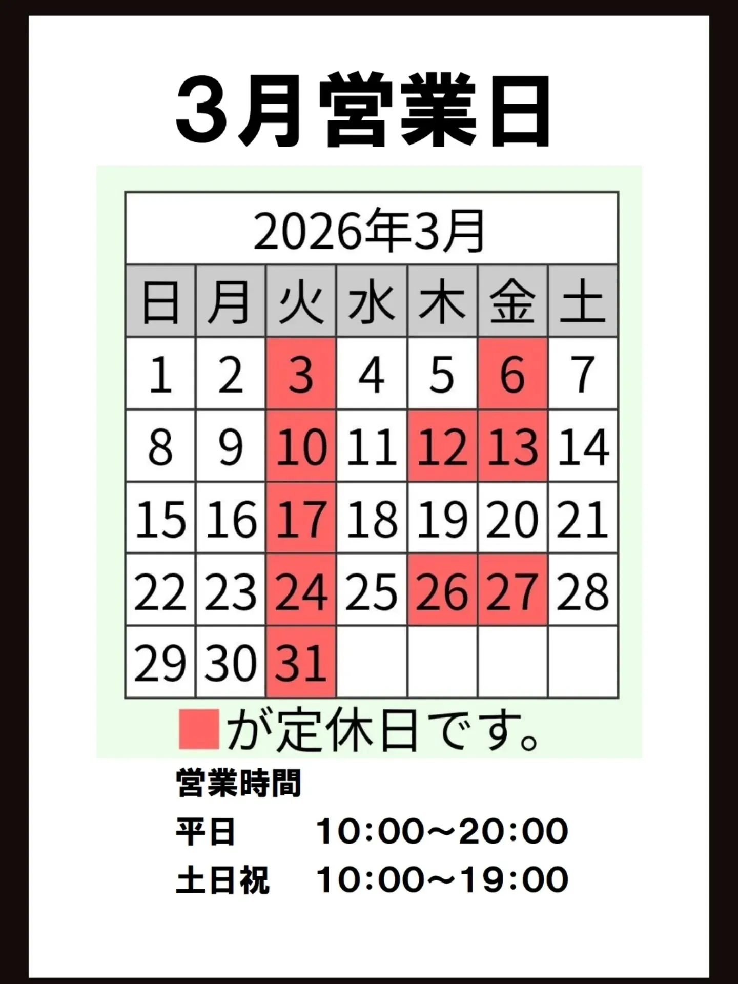 3月営業日のお知らせ